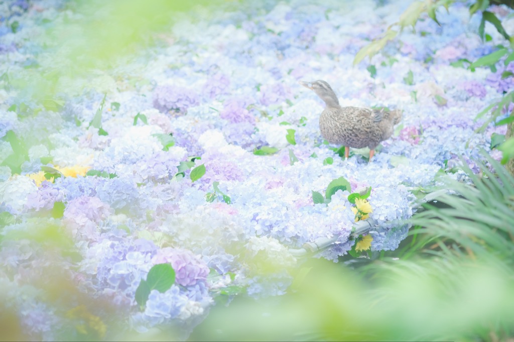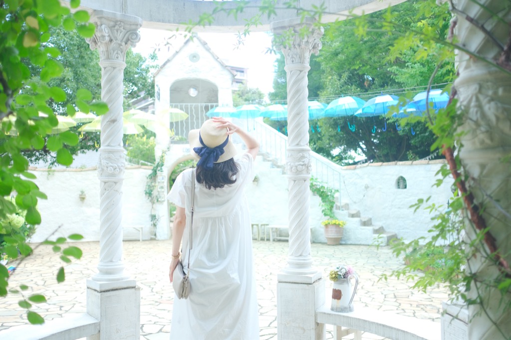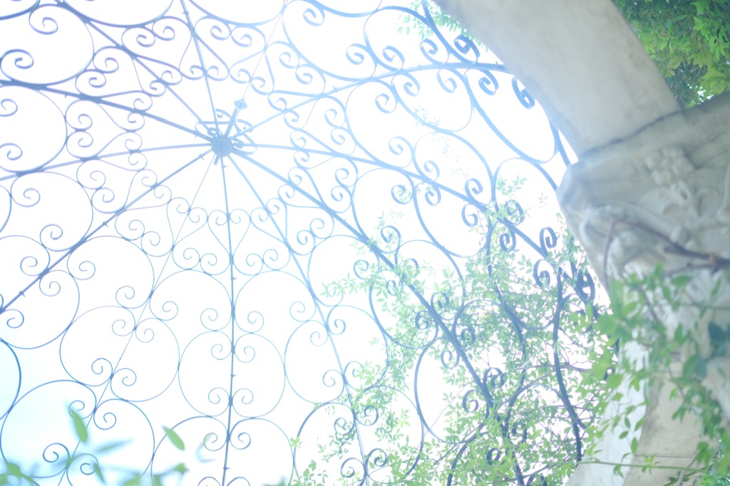 ピンクのリボンが緑とこぼれ日の中、可愛らしく映える。